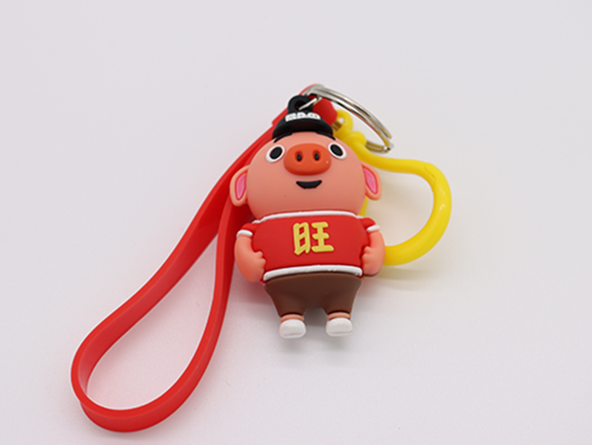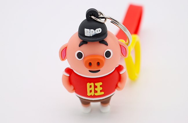 此款創(chuàng)意PVC公仔鑰匙扣,按照小豬的模樣來制造,中間紋著旺仔,讓本來可愛的公仔有著調(diào)皮的模樣。